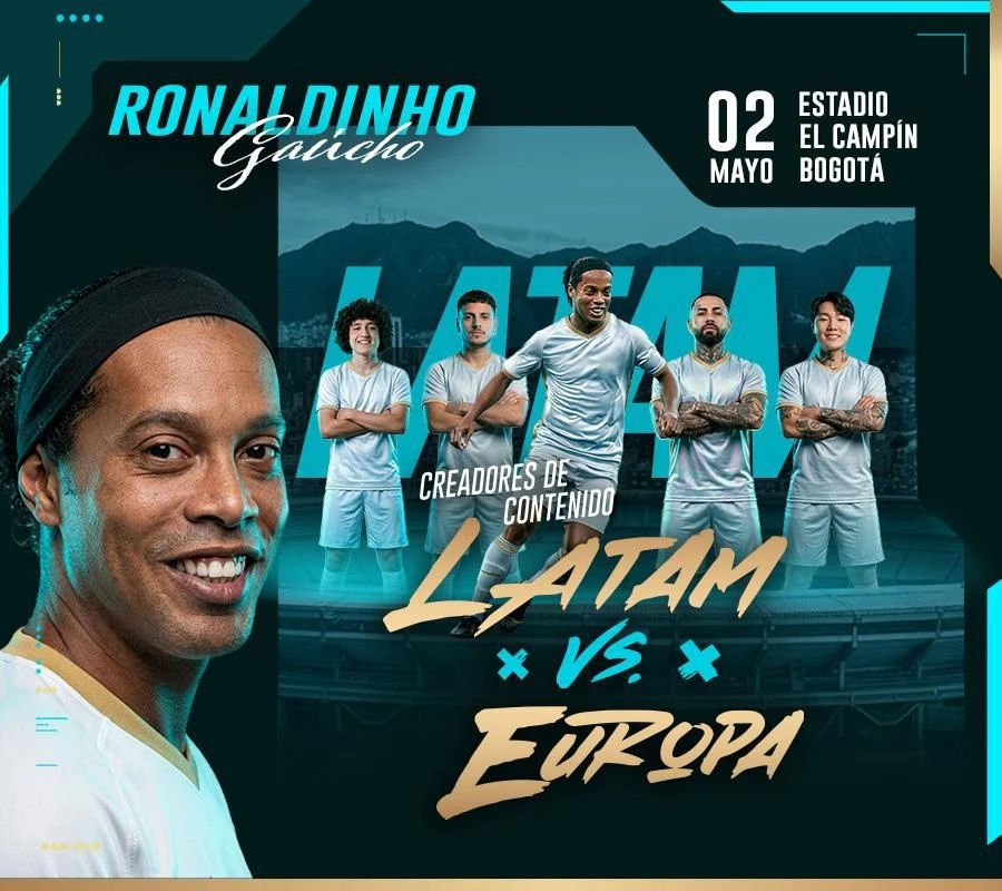Ronaldinho lidera el choque global: LATAM vs Europa, el partido que une fútbol e influencers en Bogotá.